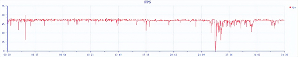 開啟自帶性能模式、極限穩(wěn)幀等功能,以最高畫質(zhì)運(yùn)行《原神》30分鐘,幀數(shù)基本可以全程穩(wěn)定在50幀左右,平均幀數(shù)50.28幀,僅在第一個戰(zhàn)斗場景時,出現(xiàn)了一定范圍內(nèi)幀數(shù)波動,隨后逐漸回到50幀左右的水平。