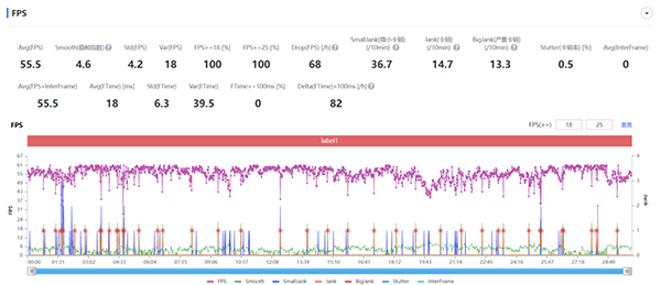 榮耀70 Pro+在《原神》中的表現(xiàn)更是讓人驚喜,來到了55.5的平均幀率已然是非常優(yōu)秀的水準,而且可以注意到,它的幀率波動集中在比較高的45~60幀之間,并且后半程的波動狀況僅僅是略多了一些,整體的體驗確實都是比較流暢的。