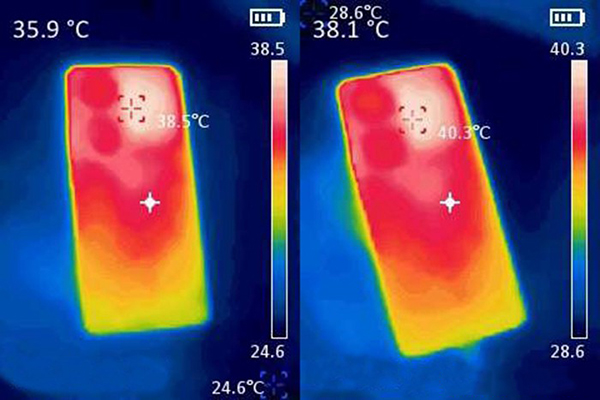 游戲時的發(fā)熱主要集中在攝像頭右側(cè)部位,兩款游戲運行時的溫度分別為38.5℃和40.3℃,溫控表現(xiàn)在目前發(fā)布的機型中算是非常不錯的了。