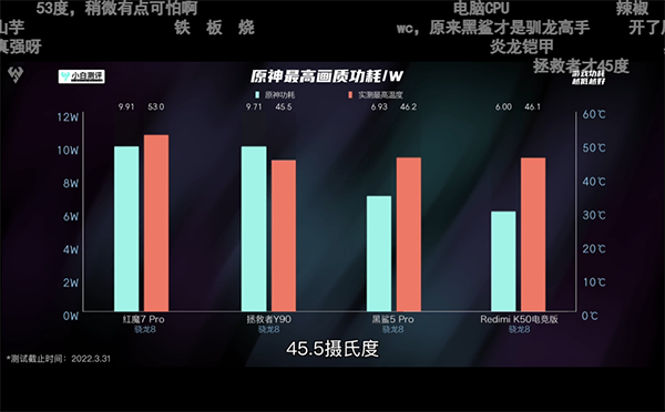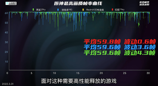 接下來(lái)再通過(guò)更能測(cè)試出手機(jī)極限性能情況的《原神》游戲,看看四款手機(jī)的表現(xiàn),經(jīng)過(guò)半小時(shí)《原神》的最高畫質(zhì)模式測(cè)試,黑鯊5 Pro、拯救者Y90與紅魔7 Pro同樣均取得了接近60幀滿幀運(yùn)行的出色表現(xiàn),但在溫度與功耗表現(xiàn)上,黑鯊5 Pro最高溫度僅為46.2℃,功耗僅為6.93W,而紅魔7 Pro則達(dá)到了53℃的高溫以及9.91W接近10W的功耗表現(xiàn),可見在功耗與溫度控制表現(xiàn)上,黑鯊5 Pro依舊是出類拔萃。