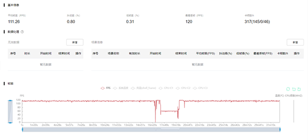 在實(shí)際游戲測(cè)試也是如此,我們用它進(jìn)行了半小時(shí)的《王者榮耀》。乍一看這個(gè)平均幀率只有111.26幀,但其實(shí)是在中途我們切換了一局,在選英雄和加載過(guò)程之中,它的智能刷新率鎖定在了60Hz,這才出現(xiàn)了這樣的成績(jī)。