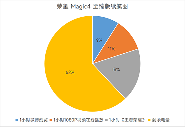 似乎也是因為這樣的因素,榮耀Magic4至臻版在微博瀏覽和在線視頻播放兩項中耗去的電量都稍微偏高一些,分別來到了9%和11%;不過它在《王者榮耀》中的耗電表現(xiàn)卻很不錯,一小時游戲僅消耗18%,可見它的游戲功耗控制水準(zhǔn)還是不錯的。當(dāng)然,總的來說,它的綜合續(xù)航表現(xiàn)還是比較不錯的,或許是LTPO屏幕和深入優(yōu)化起到了很好的省電效果。