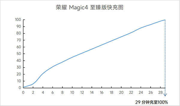 充電方面,榮耀Magic4至臻版也升級到了100W的快充,只需要29分鐘就能從2%(因為它在2%就開始自動關(guān)機倒計時了)充至100%,并在手機端顯示“已充滿”。其中在2~4分鐘間,它的充電效率非常高,其后也一直以非常平穩(wěn)的速度快速充滿,沒有出現(xiàn)明顯的降速。