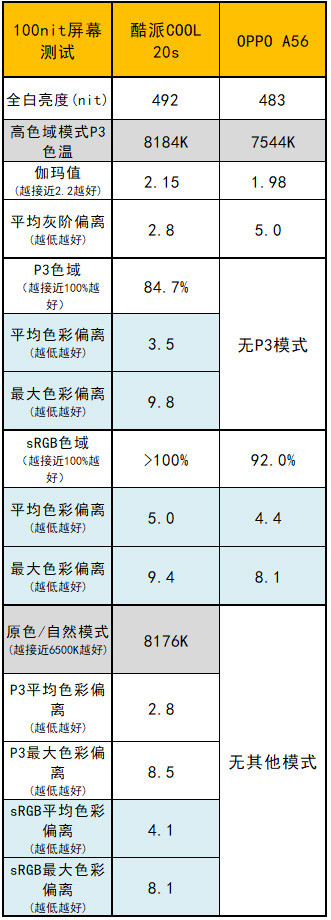 酷派COOL 20s 5G與COOL 20 Pro、OPPO A56屏幕測試數(shù)據(jù)對比