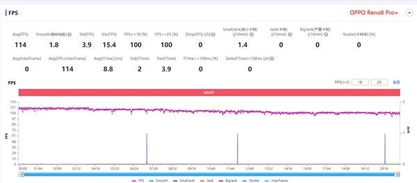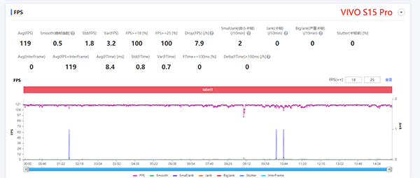 而在實(shí)際測試場景中,vivo S15 Pro在王者榮耀極限畫質(zhì)下,幀率前期呈一條筆直的直線,波動(dòng)幅度不大;后期為了穩(wěn)住機(jī)身溫度,幀率偶有較大的波動(dòng)。整體來看,測試曲線圖大致為一條直線。這里以某天璣8100機(jī)型為參考,對比下來vivo的調(diào)校水平要明顯更好一些。