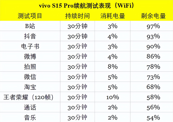 在這個電池方面,vivo S15 Pro配備了4500mAh容量雙電芯電池,我進(jìn)行了5個小時的續(xù)航測試,這是項目分別是B站、抖音、電子書、微博、拍照、微信、淘寶、120幀王者榮耀、通話和音樂,每一項測試持續(xù)時間為30分鐘。(注:測試條件為WiFi狀態(tài))