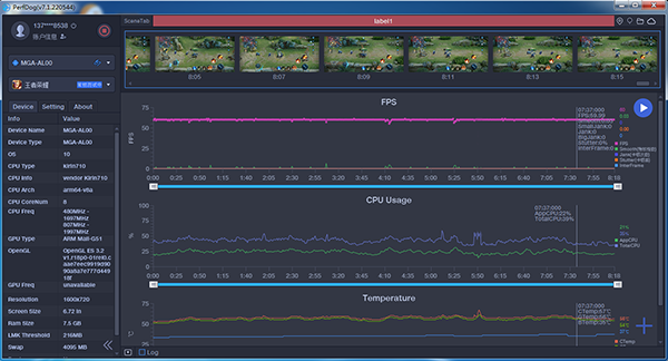 與此同時,像玩熱門的《王者榮耀》游戲,可以在高幀率、超高分辨率設(shè)置模式下全程穩(wěn)定地運行在60幀上下,確保整個游戲的過程流暢不卡頓,而通過性能狗軟件測得游戲體驗期間JANK卡頓數(shù)據(jù)為0,即未出現(xiàn)丟幀的情況,CPU總占用也維持在僅40%左右,而且手機的發(fā)熱量很小。