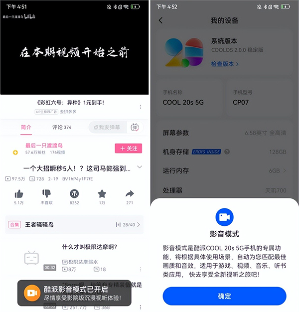 為了使這對(duì)雙揚(yáng)聲器能夠發(fā)揮出最極致的體驗(yàn),酷派COOL 20s還針對(duì)使用場(chǎng)景定制了“影音模式”,手機(jī)會(huì)根據(jù)當(dāng)前應(yīng)用的特性,自動(dòng)匹配最佳音效方案。例如當(dāng)刷短視頻或者看電影時(shí),系統(tǒng)會(huì)自動(dòng)增強(qiáng)立體聲的效果;當(dāng)玩手游時(shí),系統(tǒng)又會(huì)將音效調(diào)整為游戲環(huán)境音更為突出的狀態(tài);當(dāng)聽音樂時(shí),系統(tǒng)會(huì)令雙揚(yáng)聲器處于高保真的狀態(tài),;當(dāng)聽書時(shí),此刻的“影音模式”,就能夠?qū)⒖崤蒀OOL 20s的音效調(diào)整為人聲更加突出的狀態(tài)。