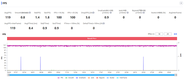 22分鐘的一局游戲下來(lái),OPPO Reno8 Pro+的幀數(shù)表現(xiàn)如圖所見(jiàn),幀數(shù)線基本穩(wěn)在120Hz,波動(dòng)值極小,與畫(huà)面的流暢度保持一致,對(duì)線、開(kāi)團(tuán)都沒(méi)有感知到任何卡頓,高幀游戲體驗(yàn)出色。
