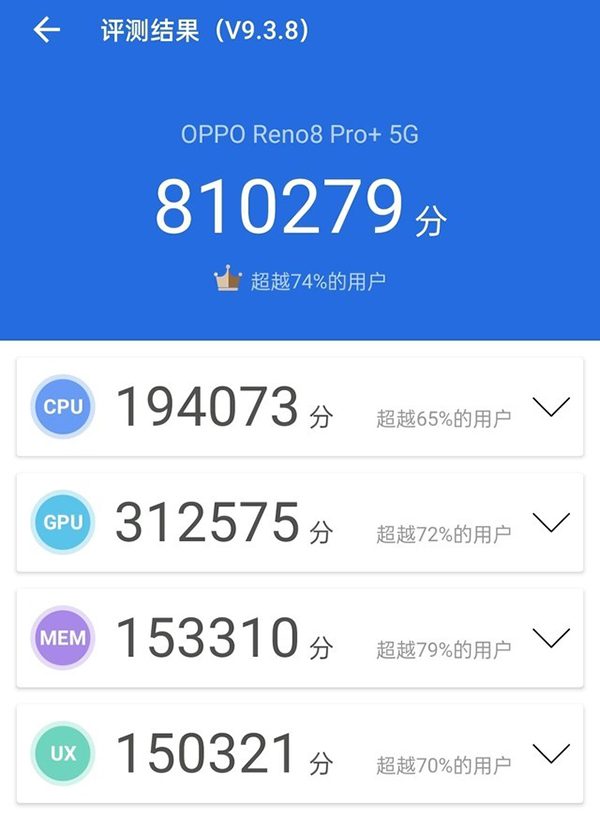手機(jī)游戲性能最關(guān)鍵的影響因素便是硬件性能配置。我們能看到Reno8 Pro+搭載了當(dāng)下?lián)碛袠O高能效比的天璣8100-MAX,擁有臺積電5nm工藝,具有高性能、低功耗的特色,同時(shí)還在游戲方面有作出針對性優(yōu)化。此外,該機(jī)還具有LPDDR5+UFS3.1的旗艦規(guī)格,使得整機(jī)的性能配置不存在瓶頸問題。從其80W+的安兔兔跑分也足以看出,Reno8 Pro+確實(shí)在性能釋放方面有不錯(cuò)的表現(xiàn)。
