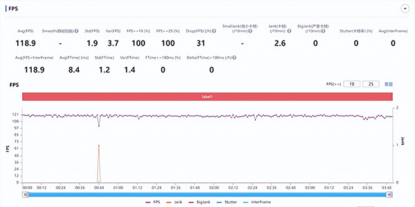 從實(shí)測成績能看出,《王者榮耀》在120幀模式的情況下,15分鐘的游戲時(shí)間里平均幀率能達(dá)到118.9FPS,接近于滿幀,而且整個(gè)過程幀率波動(dòng)較少,確實(shí)很穩(wěn)。另外,在30分鐘游戲時(shí)間后,Reno8 Pro+機(jī)身后蓋平均溫度為40.6攝氏度,單點(diǎn)峰值溫度為45.8攝氏度,同樣是一個(gè)不錯(cuò)的溫控?cái)?shù)字。這也是有賴于行業(yè)獨(dú)家的超晶石墨散熱系統(tǒng)的加持,散熱總面積為上一代的2.2倍,更能確保高效的導(dǎo)熱性能。
