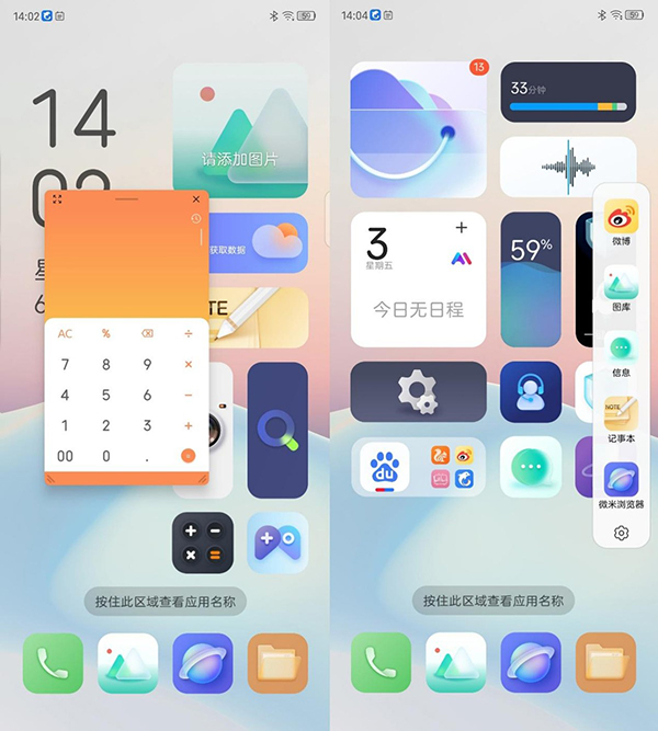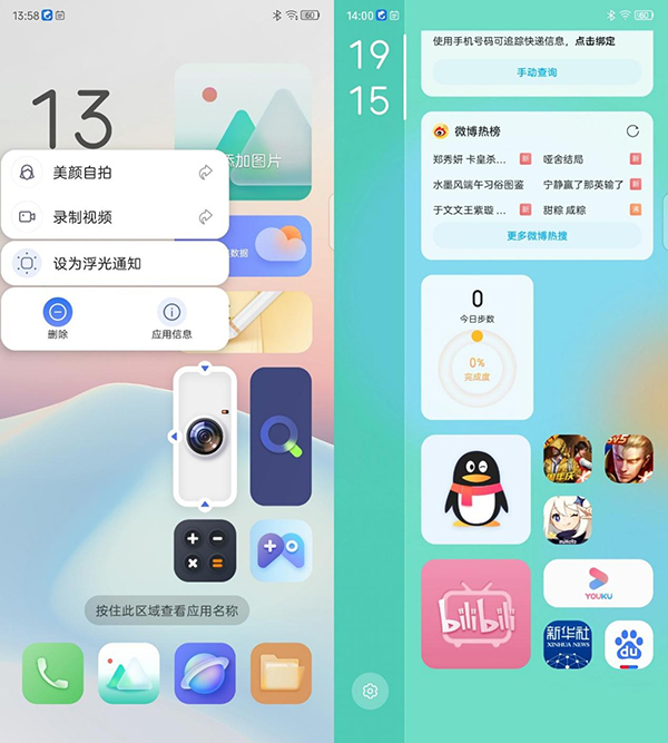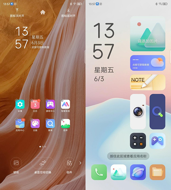 最有意思的莫過(guò)于一套系統(tǒng)里給了兩套桌面體系。一套是傳統(tǒng)的網(wǎng)格式桌面排列,另一套則是全新的系統(tǒng)UI——流光桌面,也就是當(dāng)下比較流行的大圖標(biāo)、小組件的模式。而要切換兩套桌面,只需長(zhǎng)按主界面空白處,點(diǎn)擊“桌面空間切換”即可。