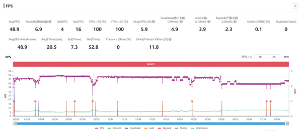 有趣的是,相較于在跑分測試中的“低調(diào)”表現(xiàn),游戲?qū)崪y環(huán)節(jié)的iQOO Neo6 SE則要“高調(diào)”不少。諸如在《王者榮耀》超高幀率、分辨率超高、畫面總質(zhì)量高清并關(guān)閉動態(tài)分辨率的設(shè)定下,其取得了接近滿分(120fps)的成績119fps。不僅如此,在《原神》圖像質(zhì)量極高并選擇60fps畫面的設(shè)定下,我們進行了一個小時的跑圖測試,發(fā)現(xiàn)iQOO Neo6 SE在前10分鐘時間里,幀率穩(wěn)居在滿幀水平,10~40分鐘穩(wěn)定在50fps左右,40分之后幀率鎖定至40fps,而最后半個小時的平均幀率也能達到48.9fps。