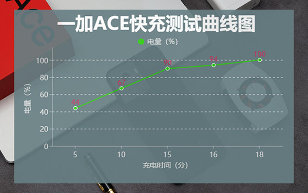 首先,小編進行了充電測試,先將后臺應用全部清理干凈,從起始1%的電量開始充電。5分鐘充至44%,10分鐘充至67%,15分鐘充至90%,16分鐘充至93%,18分鐘即可完全充滿,比小米10至尊紀念版快了近5分鐘 。當然,你也許會擔心這么快的充電速度會帶來充電損耗嗎?官方表示:一加Ace的電池壽命是行業(yè)800次標準的2倍,在完全充放電1600次后健康度依然能夠保持80%以上,為大功率充電帶來更高的安全性。