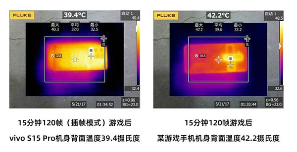 在不采用任何輔助散熱方式的情況下,兩臺手機(jī)在相同的120幀游戲畫面下運行15分鐘后,vivo S15 Pro的機(jī)身背面溫度僅為39.4攝氏度,而某游戲手機(jī)的機(jī)身背面溫度則為42.2攝氏度。由此可見,獨顯芯片Pro能夠切實幫助vivo S15 Pro在擁有相同游戲畫面體驗的前提下,實現(xiàn)更為舒適的游戲體驗。