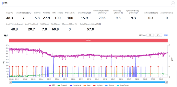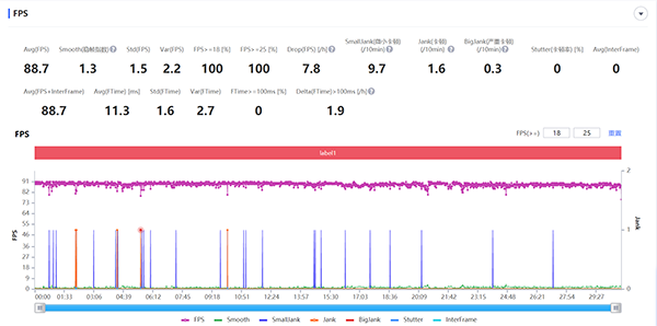 當(dāng)前室溫25℃左右,《和平精英》中選擇流暢畫質(zhì)+90幀模式,連續(xù)玩30分鐘。實測它的平均幀率為88.7幀,雖說平均幀率沒有達到89幀以上,但它的Drop值(平均每小時相鄰兩個FPS點下降大于8幀的次數(shù))只有7.8,這么來看還是挺優(yōu)秀的。
