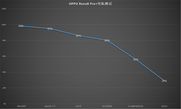 5小時(shí)高強(qiáng)度測(cè)試下來,Reno8 Pro+最終剩余29%電量,屬于4500mAh電池的正常水平,換算成日常正常使用,基本上一天一充問題不大。