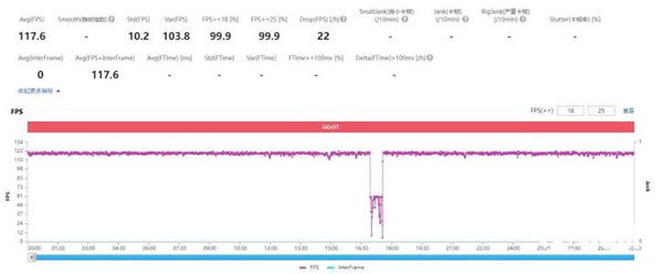 首先來看《王者榮耀》的表現(xiàn),測試中在室溫25度環(huán)境中進行,開啟120幀+高清模式畫質,而后進行正常的游戲對局,結束一局后立刻進行匹配,總共進行30分鐘的測試,期間通過PerfDog性能狗來記錄數(shù)據(jù)。在30分鐘的游戲中,平均幀率117.6幀,除了局間切回大廳以及排隊的強制幀率降低外,能穩(wěn)定輸出120幀流暢畫面,游戲中無明顯幀率波動、無卡頓情況。