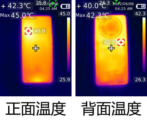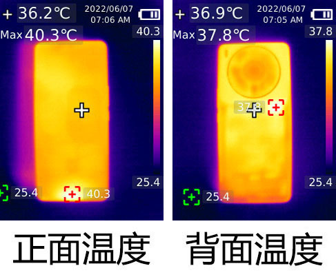 發(fā)熱情況表現(xiàn)不錯, 30分鐘游戲后手機正面最高溫40.3度,主要發(fā)熱區(qū)域在底部USB-C接口處,傳統(tǒng)的處理器區(qū)域溫度溫熱;背面最高溫度37.3度,體感上幾乎感受不到發(fā)熱。