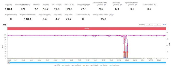 首先來看國(guó)民手游《王者榮耀》的表現(xiàn),測(cè)試中使用X模式,開啟120幀+高清模式畫質(zhì),而后進(jìn)行正常的游戲?qū)?,結(jié)束一局后立刻進(jìn)行匹配,總共進(jìn)行30分鐘的測(cè)試,期間通過PerfDog性能狗來記錄數(shù)據(jù)。騰訊ROG游戲手機(jī)6 Pro在30分鐘的游戲中,平均幀率118.4幀,除了局間切回大廳以及排隊(duì)的強(qiáng)制幀率降低外,在峽谷中基本都穩(wěn)定在120幀,無明顯幀率波動(dòng)、無卡頓情況。