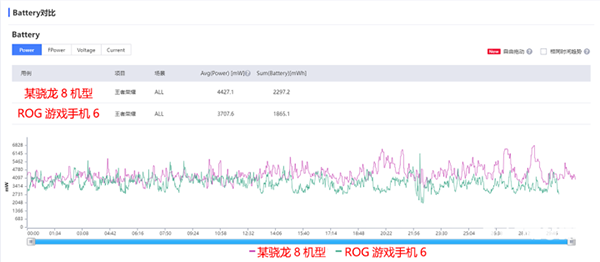 在功耗表現(xiàn)上,騰訊ROG游戲手機(jī)6 Pro的表現(xiàn)也相當(dāng)不錯(cuò)。這里我們使用了一款驍龍8游戲手機(jī)進(jìn)行了對(duì)比測(cè)試,兩部手機(jī)同時(shí)進(jìn)行30分鐘120幀高清畫質(zhì)的實(shí)際對(duì)局,騰訊ROG游戲手機(jī)6 Pro平均功率為3.7W,另一部對(duì)比機(jī)型為4.4W。