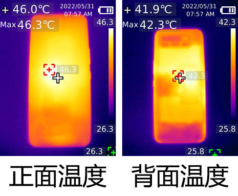 30分鐘游戲后進(jìn)行測(cè)溫,手機(jī)正面最高溫46.3度,背面最高溫42.3度。正面溫度看似爆表,但通過顏色標(biāo)識(shí)不難發(fā)現(xiàn),最高溫在手機(jī)正中心位置,兩側(cè)的手持區(qū)域溫度并不高,實(shí)際上的體感遠(yuǎn)沒有數(shù)字表現(xiàn)得那么夸張。這其中的奧妙在于,騰訊ROG游戲手機(jī)6 Pro采用了處理器中置的內(nèi)部設(shè)計(jì),因此全屏橫置游戲時(shí),發(fā)熱是從中間開始擴(kuò)散,而非大眾機(jī)型那樣從左側(cè)開始發(fā)熱。這就讓溫控策略可以更奔放一些,畢竟此時(shí)體感上還感受不到發(fā)燙。
