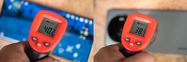 緊接著我們使用溫度槍測量了手機表面溫度,此時屏幕最高溫度為40.6℃,背部SoC附近最高溫度為38.7℃,完全在可接受范圍內。之所以會出現(xiàn)這樣正面溫度高于背部溫度,我猜測可能是由于素皮有一定隔熱效果的緣故。