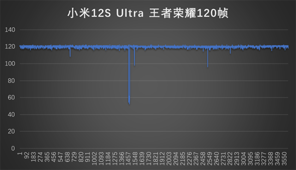 落實到具體的游戲表現(xiàn)上,在《王者榮耀》120幀模式下,60分鐘的平均幀率為119.72幀,平均功耗為3.37W。從幀率曲線圖上來看,60分鐘一直維持在滿幀運行。