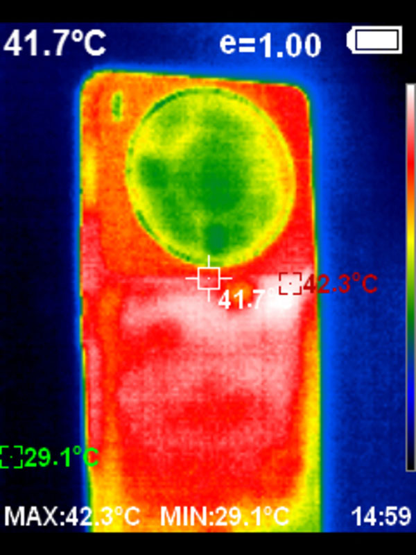 小米12S Ultra在《原神》極高畫質(zhì)+60幀模式下,30分鐘全場景跑圖后的平均幀率為60.38幀,平均功耗為4.99W。從幀率圖上可以看到,基本維持在一條直線,說明小米12S Ultra擁有強勁的性能釋放。同時,得益于小米12S Ultra所采用的葉脈冷泵散熱系統(tǒng),經(jīng)過《原神》高強度的“摧殘”,機身的正面溫度為44.3度,背面是42.3度,還算比較涼爽。