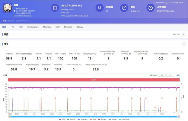 通過(guò)幀率曲線圖能夠看到,騰訊ROG游戲手機(jī)6 Pro在面對(duì)最高畫(huà)質(zhì)的《原神》依舊表現(xiàn)的綽綽有余,不論是跑圖還是打怪都未感受到卡頓的情況。