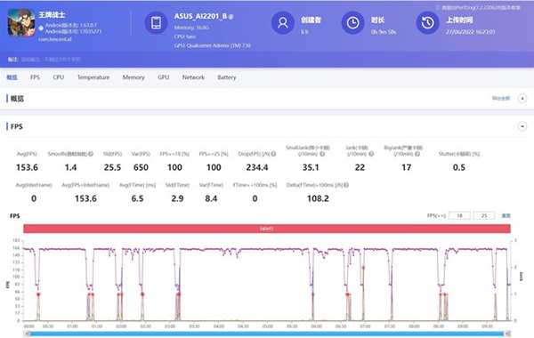 在《王牌戰(zhàn)士》的測(cè)試中,騰訊ROG游戲手機(jī)6 Pro平均幀率153.6幀,幾處明顯的掉幀環(huán)節(jié)是角色被擊敗后的加載畫(huà)面,在對(duì)戰(zhàn)環(huán)節(jié)還是能穩(wěn)定保證在165幀左右的,相比此前不支持165幀的產(chǎn)品,會(huì)更加絲滑順暢。