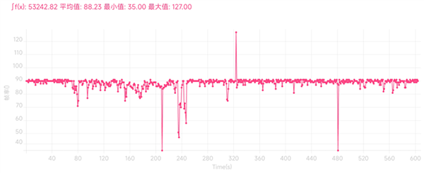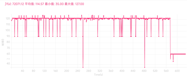 《王者榮耀》支持最高畫質(zhì)和120幀模式,開啟后游玩將近10分鐘,平均幀率114.57 FPS,幀率波動不大。