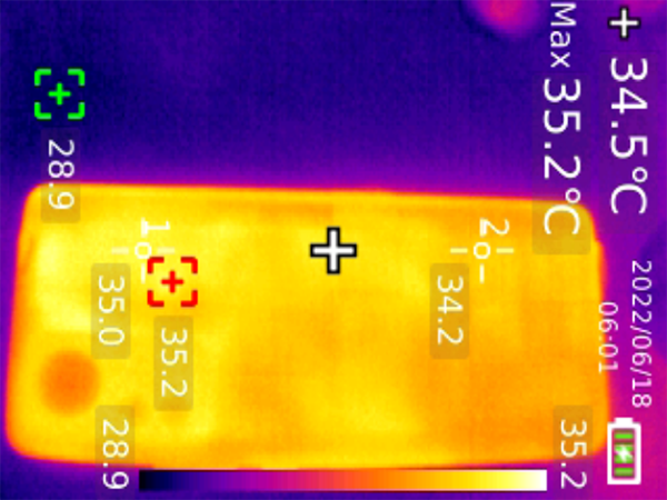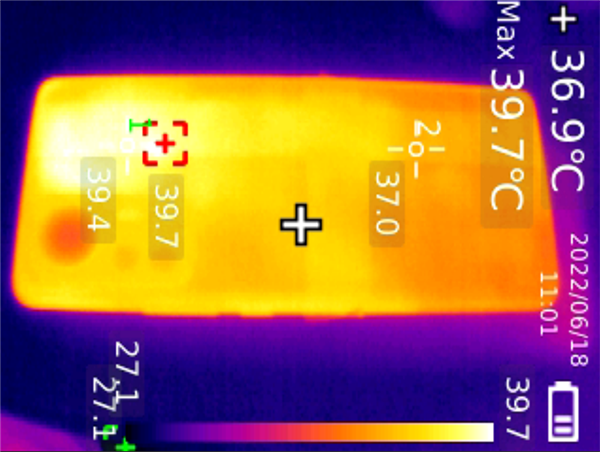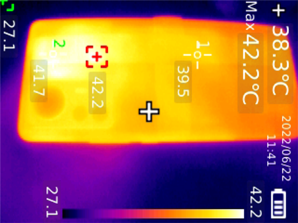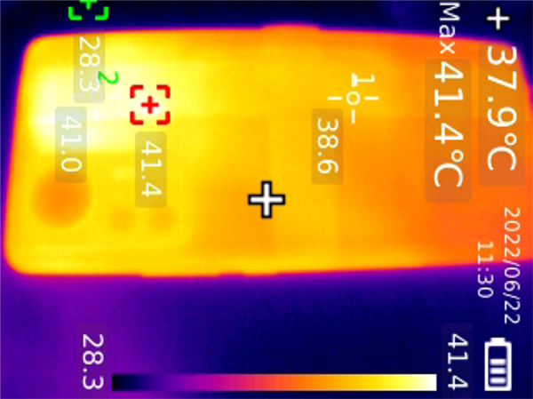 《原神》測試進(jìn)行到10分鐘時,后蓋溫度最高41.4℃,20分鐘后,后蓋最高溫度僅有42.2℃。