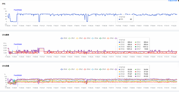 需要注意的是中間的斷崖式下降出現(xiàn)在地圖傳送時(shí),并不是游戲突然卡頓造成的。