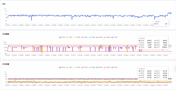 具體到游戲中,在測(cè)試室溫為30℃的環(huán)境下,可以看到在運(yùn)行《原神》時(shí)手機(jī)始終保持在較高的CPU釋放狀態(tài),超大核維持在1.5GHz,大核維持在1.6GHz,并且整體的CPU負(fù)載在80%左右。