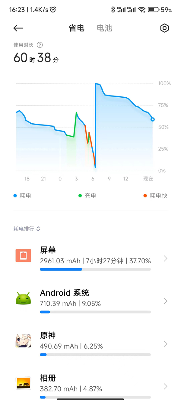 可以看到,在經(jīng)過四小時(shí)的重度續(xù)航測(cè)試后,小米12S從原本的100%下滑至40%,這個(gè)表現(xiàn)不用我多說大家心里應(yīng)該都有數(shù)。為了更加接近大多數(shù)用戶的使用場(chǎng)景,我也將其作為主力機(jī)使用了一整天,從系統(tǒng)自帶的電量數(shù)據(jù)圖可以看到,從睡覺前一直使用到第二天下午四點(diǎn)半都還能剩余58%,續(xù)航方面大家真的不必過于擔(dān)心了。
