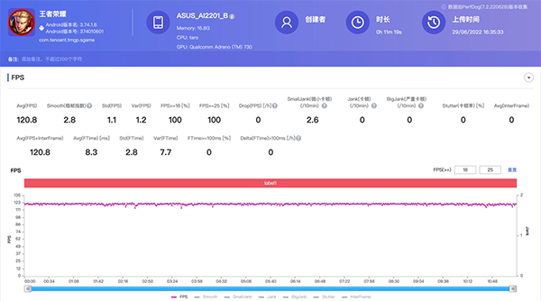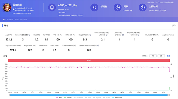 首先是王者榮耀,我們將手機的性能模式調(diào)整為X模式,風扇設(shè)置為酷寒模式(第三檔),ROG 6 Pro已經(jīng)支持《王者榮耀》的120幀模式,因此我們開到最高畫質(zhì)120幀來游玩,最終的幀率穩(wěn)穩(wěn)一條直線,平均幀數(shù)121幀,屏幕最高溫35.5度,背部最高溫34.4度,由于帶上了散熱背夾,此時功耗來到了8.9W。