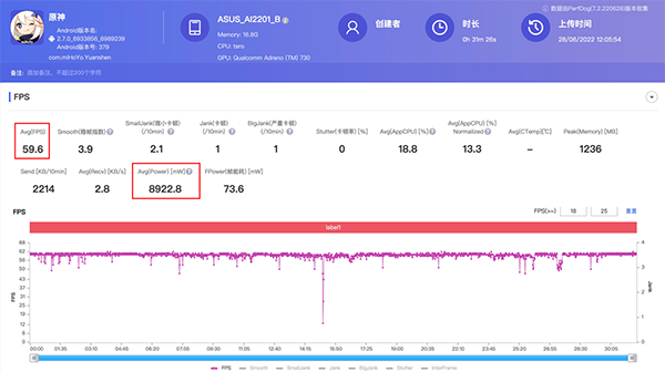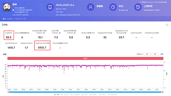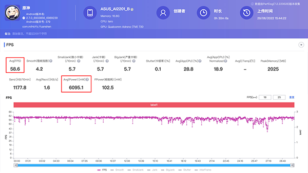 那么如果不帶背夾開啟X模式,表現(xiàn)又如何呢?第四輪30分鐘游戲后,這次的表現(xiàn)有點出乎意料,可以看到前15分鐘的幀率波動非常小,甚至在四輪測試中表現(xiàn)最好,但隨著溫度的升高,后半段的幀數(shù)波動比較明顯,最終平均幀數(shù)為58.6幀,屏幕最高溫45.5度,背面最高溫44.7度,中框最高溫44.5度,功耗上升到6.0W,看來溫度對幀率的影響是實打?qū)嵉?,所以原神這款游戲更推薦大家使用均衡模式游玩,其他負載較小的手游可以直接開啟X模式滿血暢玩。