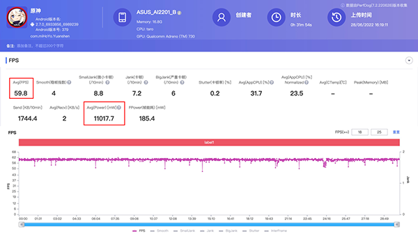 第二輪我們在第一輪的基礎(chǔ)上接上電源,風扇選擇最強的急凍模式(第四檔),性能模式為X+模式,30分鐘游戲后,幀率曲線更加平滑,毛刺更少,最終平均幀率進一步提升到59.8幀,可以說已經(jīng)征服了原神。此時機身屏幕面最高溫39.6度,背面最高溫35度,中框最高溫33.2度,此時功耗為11W,不到40度的溫度表現(xiàn)足以證明這款酷冷風扇6的強悍散熱能力。