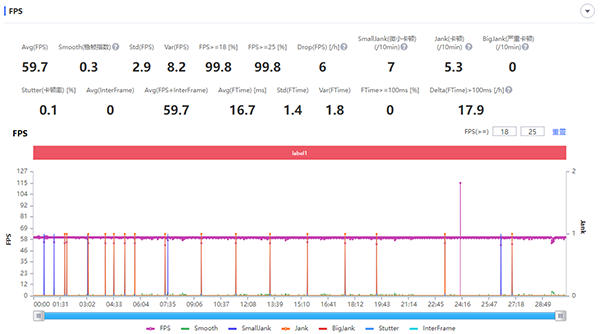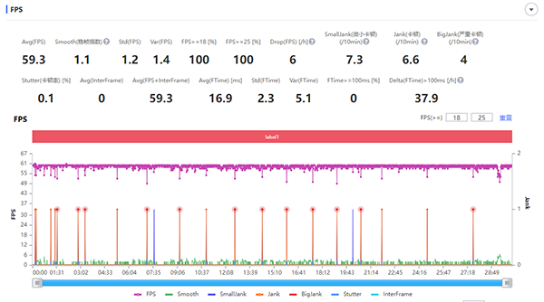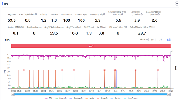從測試成績可以看到,即使是不使用外置冷卻設(shè)備,騰訊ROG游戲手機(jī)6 Pro也有非常不錯的幀率表現(xiàn),全程幾乎都是頂著60fps在跑,平均幀率達(dá)到了59.3fps,整個過程中沒有明顯的卡頓,游戲體驗(yàn)比較不錯。