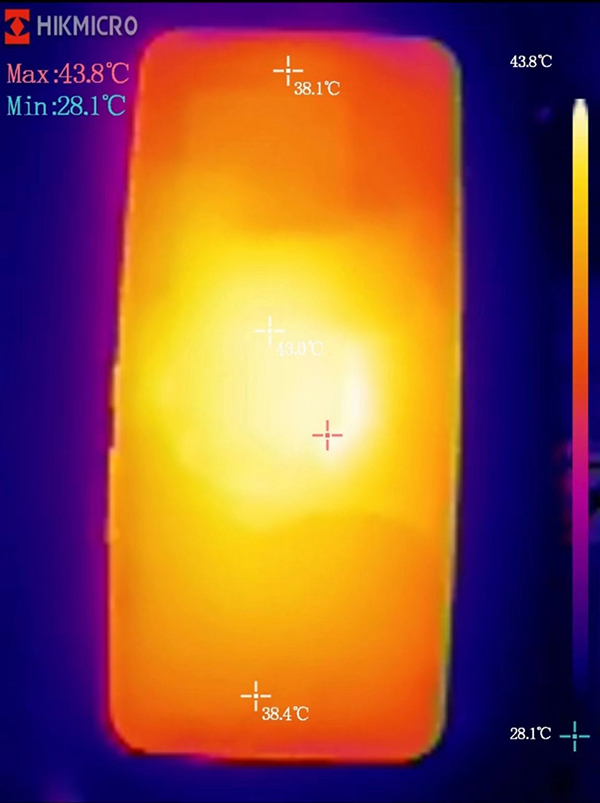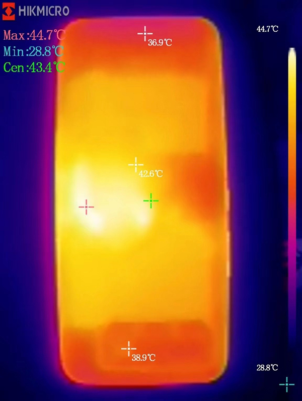溫度方面,游戲中開啟實(shí)時信息條可以看到手機(jī)的系統(tǒng)溫度為43°C。通過測溫儀測得該機(jī)正面溫度最高為43.8°C,背面最高溫度為44.7°C,中置架構(gòu)的熱源集中在手機(jī)中間部位,相對來說可以給玩家?guī)砀玫挠螒蝮w驗(yàn)。能在這樣的溫度下實(shí)現(xiàn)接近60fps的平均幀數(shù),還是可以看得出高通驍龍8+Gen 1的能耗比得到了比較大的提升,同時騰訊ROG游戲手機(jī)6 Pro的散熱表現(xiàn)還是比較不錯的。