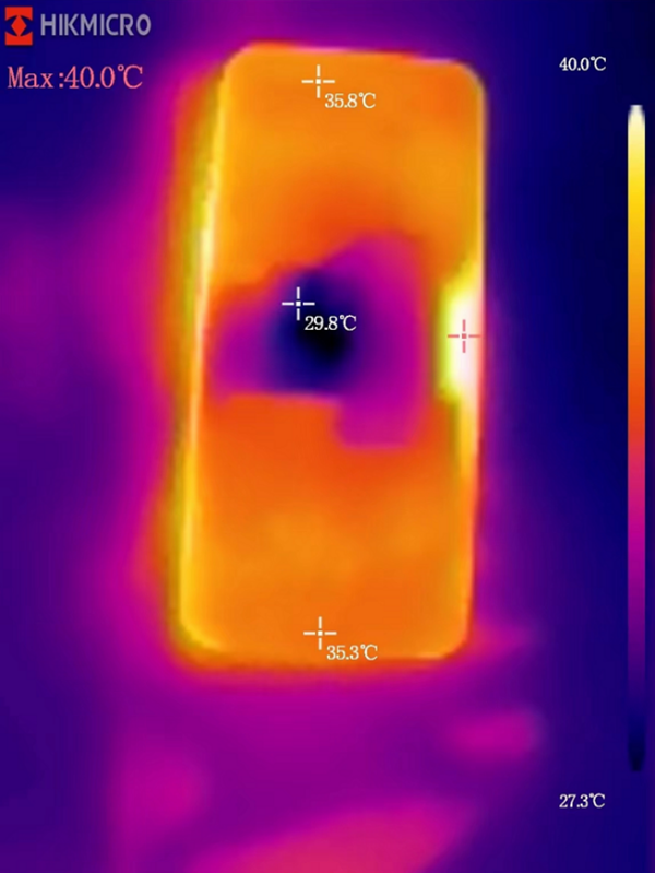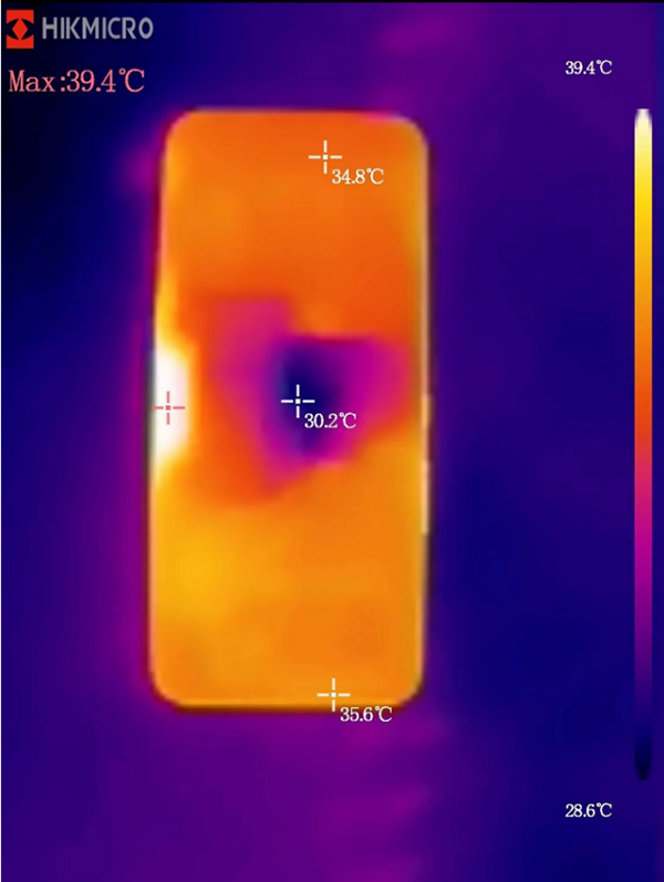 從熱成像儀拍攝的溫度畫面可以看到,在拿下酷冷風(fēng)扇6的瞬間,畫面中溫度最低點(diǎn)為酷冷風(fēng)扇6和手機(jī)的接觸點(diǎn)。其中使用急凍模式時手機(jī)表面溫度僅為27.3°C,使用酷寒模式時手機(jī)表面溫度僅為28.6°C。由此可以看出,酷冷風(fēng)扇6的降溫效果還是非常明顯的。因?yàn)轱L(fēng)扇啊還可以帶動兩側(cè)的氣流,在加裝了酷冷風(fēng)扇6后,手機(jī)的整體溫度也得到了降低,整體的游戲體驗(yàn)表現(xiàn)會更好。