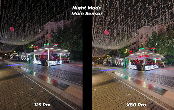 白天拍照對(duì)比其實(shí)很難看到差距,夜景拍照才是重頭戲,首先是兩款手機(jī)的夜景主攝拍照對(duì)比,均打開(kāi)夜景模式。通過(guò)直出的照片來(lái)看,vivo X80 Pro畫(huà)面亮度比小米12S Pro高了許多,畫(huà)面細(xì)節(jié)更豐富,而且高光壓制的也很棒。小米12S Pro因?yàn)榱炼鹊土颂啵瑢?dǎo)致畫(huà)面效果完全不如vivo X80 Pro。