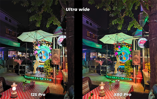 超廣角夜景拍照對(duì)比,vivo X80 Pro再次呈現(xiàn)出了極為優(yōu)秀的畫(huà)面感,高光控制到位,細(xì)節(jié)豐富,譬如燈光牌、紅白拼接的桌子以及照片上方的綠葉。