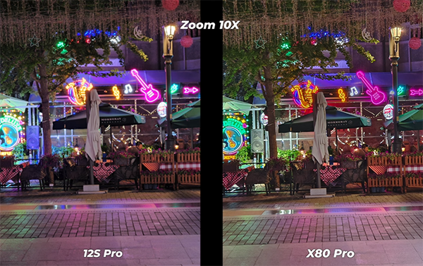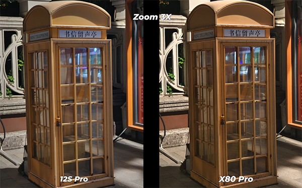 夜景3倍光學(xué)變焦對(duì)比,乍一看差別只是色彩不同,但其實(shí)差別還是蠻大的,仔細(xì)觀看可以發(fā)現(xiàn)vivo X80 Pro電話亭周圍的地面細(xì)節(jié)更豐富,而小米12S Pro出現(xiàn)了涂抹的痕跡。