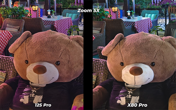 5倍變焦對(duì)比,雖然vivo X80 Pro畫(huà)面亮度更高,近景細(xì)節(jié)更豐富,但是白平衡出現(xiàn)了失調(diào),譬如遠(yuǎn)景的黃白桌布,已經(jīng)出現(xiàn)了泛白的情況。而小米12S Pro畫(huà)面感更高。