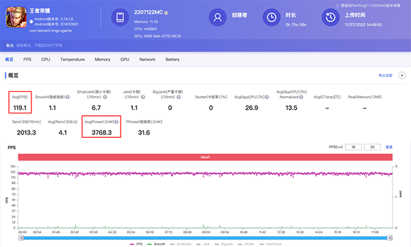 在王者榮耀中,我們選擇最高畫質(zhì),關(guān)閉動(dòng)態(tài)分辨率,一局20分鐘左右的游戲之后,這顆天璣9000+的平均幀率為119.1幀,幀率曲線整體為一條直線,功耗則在3.7W左右。