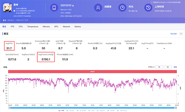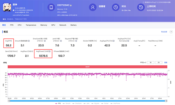 經(jīng)過30分鐘的游戲之后,小米12 Pro天璣版最終的平均幀數(shù)為58.2幀,雖然整體的波動(dòng)幅度比較明顯,但還是穩(wěn)定成了近似一條直線,而且功耗也只有5.5W左右。