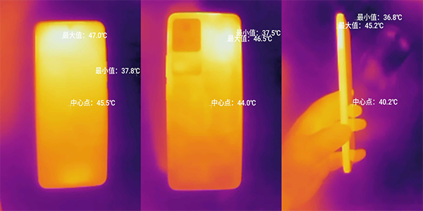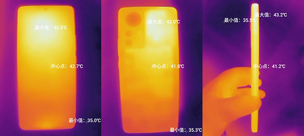 溫度方面,機(jī)身正面最高溫度為43.5度,背面最高溫度為43度,中框最高溫度為43.2度,雖說算不上“凍手”,但至少可以愉快玩耍了。看到這你可能還覺得感知不明顯,無非就是溫度低了一些,但接下來的對(duì)比有些出乎意料。
