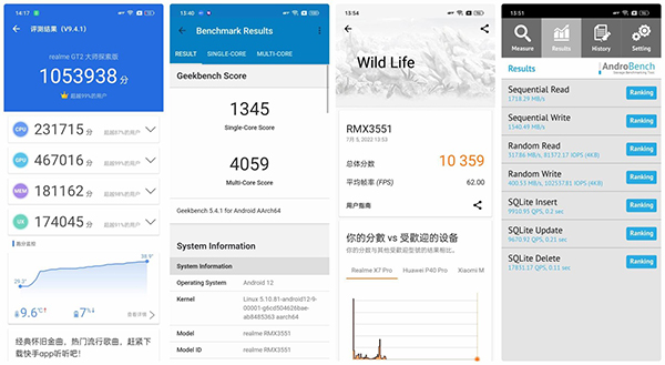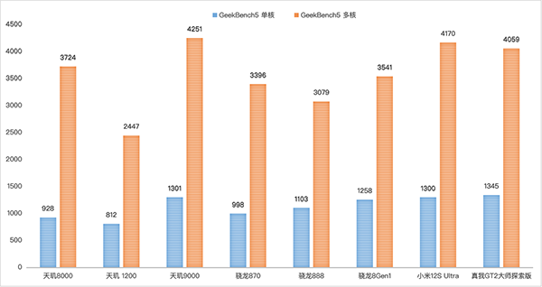 GeekBench5跑分方面,真我GT2大師探索版單核為1345分,多核4059,相較于驍龍8,驍龍8+的單核、多核分?jǐn)?shù)都有不同程度的增加。